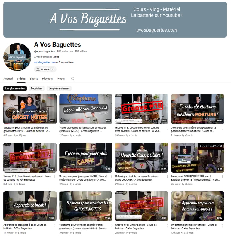 Découvrez ma passion pour la batterie à travers ma chaîne YouTube. Mes ressources pédagogiques, mes tests matériels, mes vlogs, etc... Réservez un stage ou télécharger les partitions de mes cours en PDF.